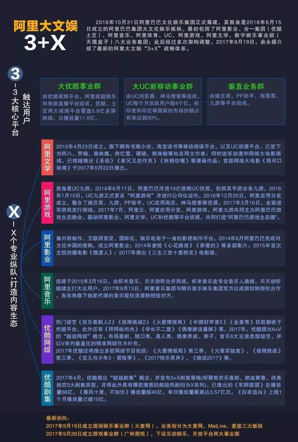 阿里巴巴大文娱从架构上在2016年下半年形成了“3+X”的业务矩阵。3个核心分发平台分布是:优土视频平台、UC事业群(UC浏览器+神马搜索)、垂直业务群(APP分发及票务游戏分发平台)三大分发平台,以及辅助性的X个内容,包含阿里文学、阿里游戏、阿里影业、阿里音乐、优酷网综电视剧等。
