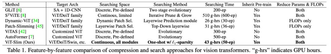下面是 ViT-Slim 跟其他一些 ViT 压缩或者瘦身方法的区别,主要在于搜索方法以及使用范围的不同。