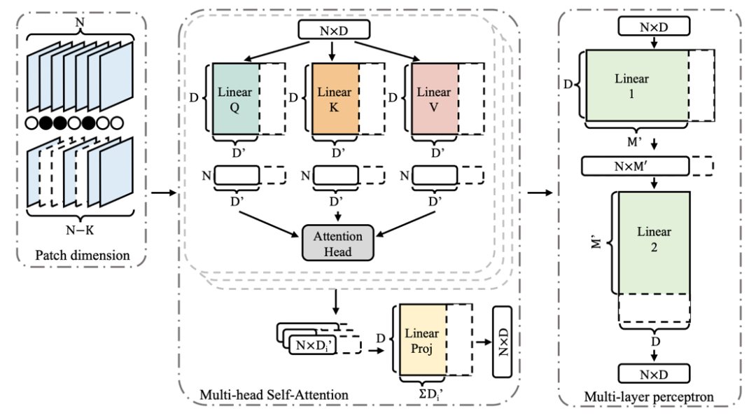 ViT Slimming 同时考虑了 ViT 里面三个模块:输入 tokens,MHSA 和 MLP 模块,它的训练过程可以看成是一个基于权重共享的子网络搜索过程,主干网的权重可以通过加载预训练好的模型参数来加快搜索。训练过程中 soft mask 接近 0 对应的特征相当于动态地被裁剪 / 丢弃了。该方法的优点是只需训练 / 搜索一次,就可以通过排序 mask 得到无数个子网络,非常高效灵活。算法优化函数由原始的 cross-entropy 和