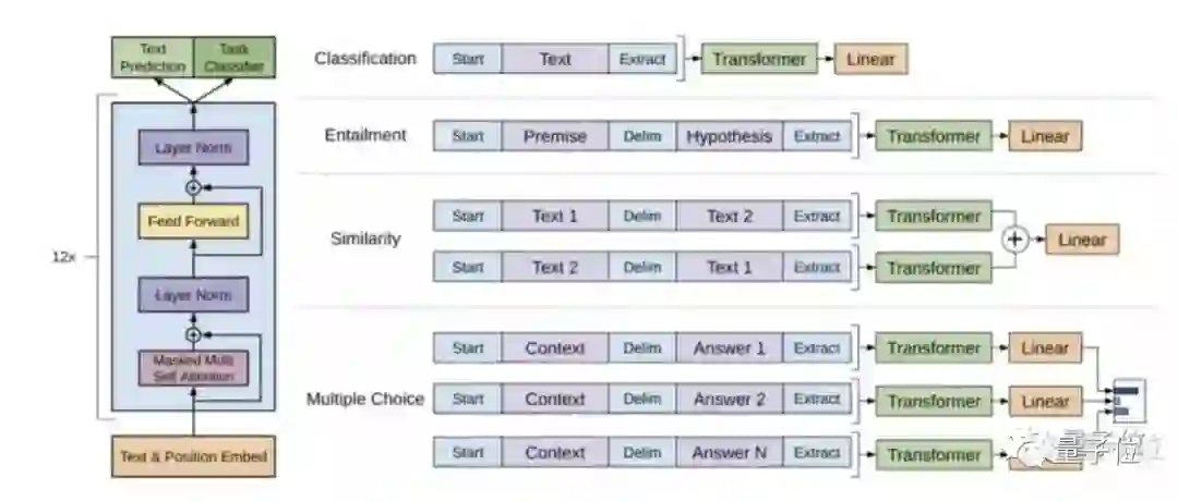 上图左部分,是研究中使用的Transformer架构以及训练目标。右边部分,是针对特定任务进行微调。将所有结构化输入转换为token序列,由预训练模型处理,然后经过线性+softmax层处理。