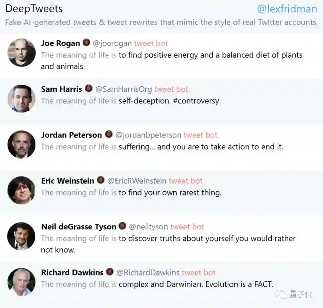 这样的例子还有很多,比如让它以“生命的意义是”开头,模仿名人的推特: