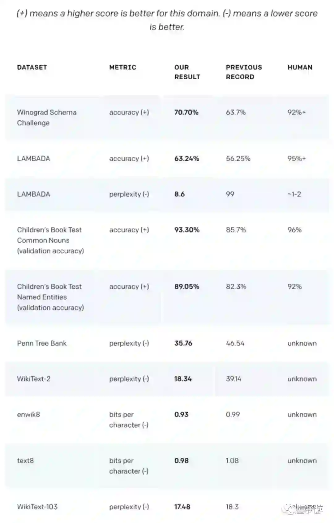 作为一个没有经过任何领域数据专门训练的模型,它的表现比那些专为特定领域打造的模型还要好,横扫各大语言建模任务。