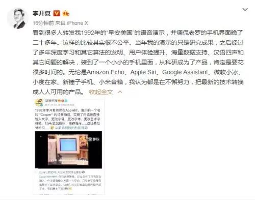 除此之外,更有甚者翻出了李开复在1992年“早安美国”语音演示视频作为比较,演示视频中一个名为“Casper”的语音助手拥有文字输入、字体变更、打开 /推出应用程序的功能。