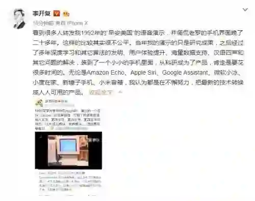 这项在当时引起不小轰动的成就再次被翻出,将矛头直接指向了老罗发布的新品,调侃其手机界面晚了二十多年。对于这次调侃,李开复发布微博回应称,1992年演示的只是研究成果,将技术装进手机其中存在大量工程,这么对比并不公平。