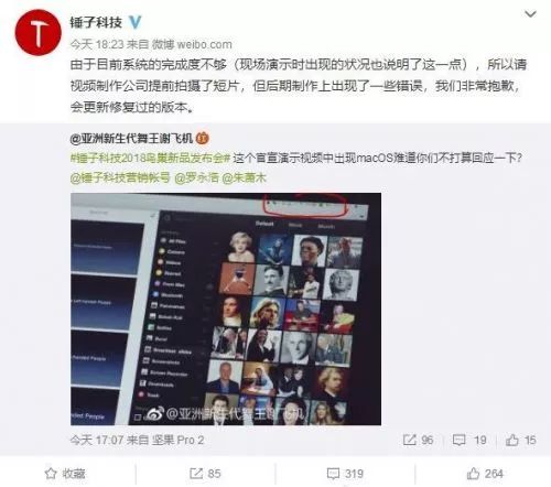 对此,锤子科技官方近日在官方微博上回应“由于目前系统的完成度不够(现场演示时出现的状况也说明了这一点),所以请视频制作公司提前拍摄了短片,但后期制作上出现了一些错误,我们非常抱歉,会更新修复过的版本。”
