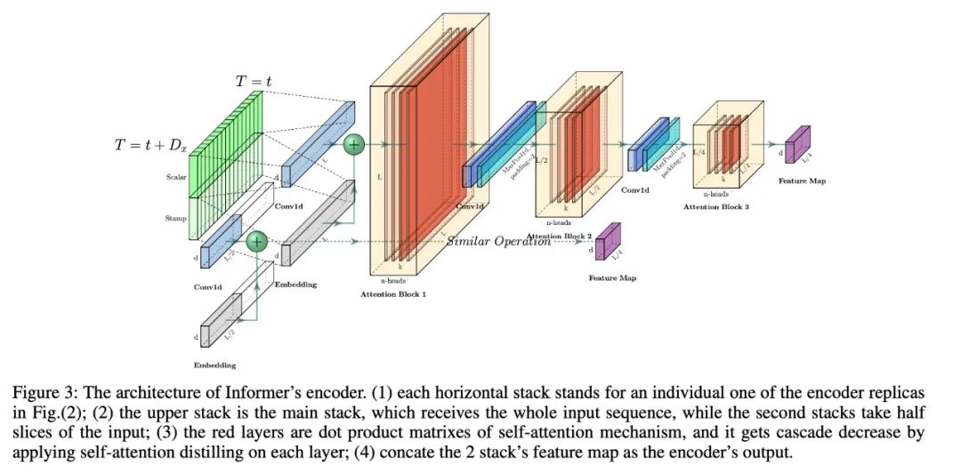 其中 包含Multi-Head ProbSparse self-attention以及重要的attention block的操作。