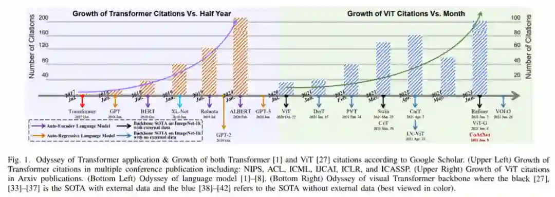 如上所述,在 vanilla Transformer 于 NLP 领域取得巨大成功之际,基于注意力的模型在视觉识别领域也得到了很多关注。最近,有大量研究将 Transformer 移植到 CV 任务中并取得了非常有竞争力的结果。例如,Dosovitskiy et al. [27]提出了一种使用图像 patch 作为图像分类输入的纯 Transformer,在许多图像分类基准上都实现了 SOTA。此外,视觉 Transformer 在其他 CV 任务中也实现了良好的性能,如检测 [28]、分割[29]、跟踪[30]、图像生成[31]、增强[32] 等。