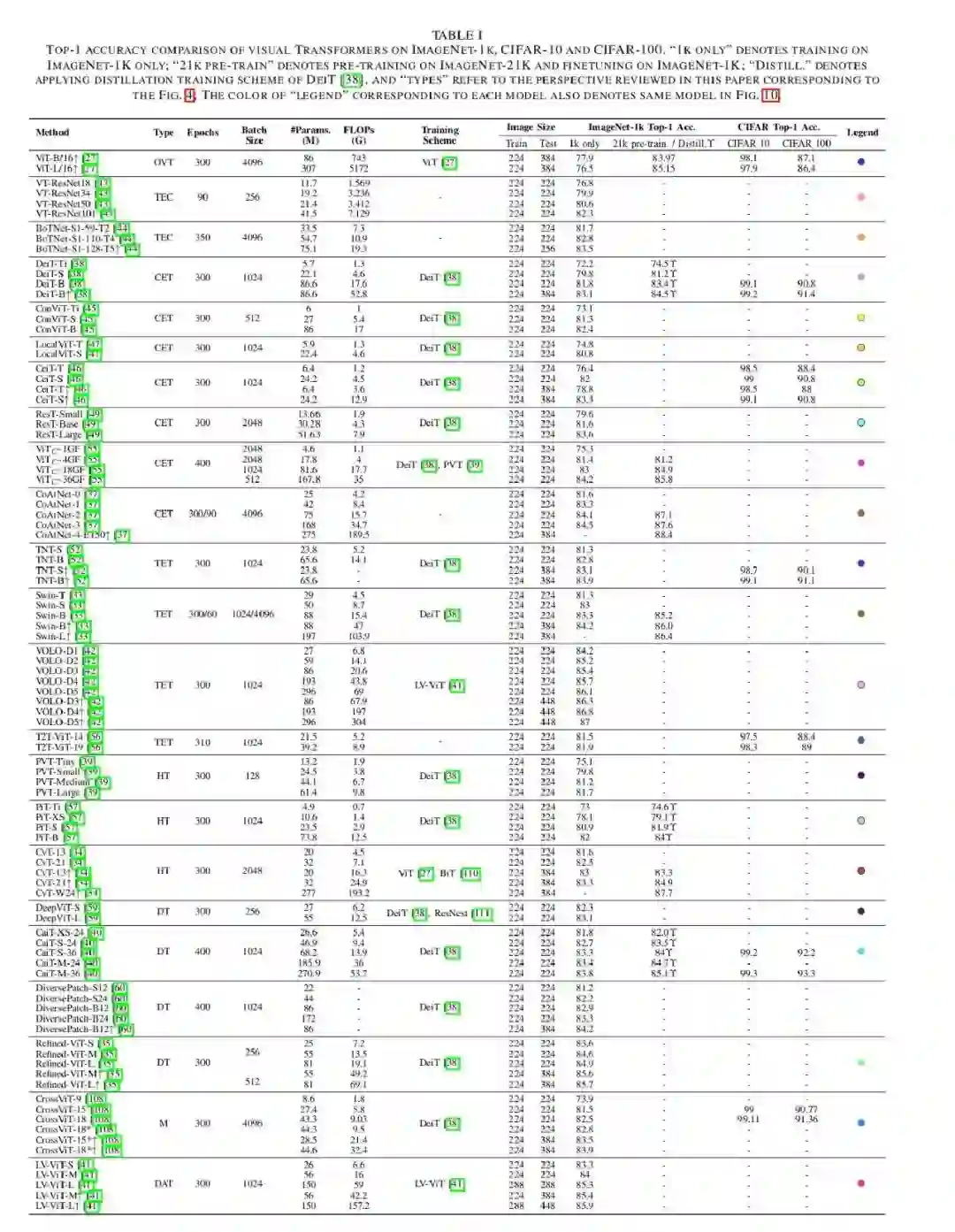 下表 I 总结了以上 Transformer 模型在主流分类基准上的表现: