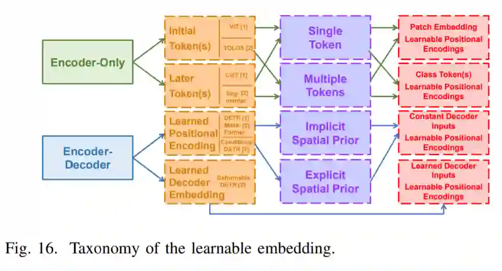 Transformer 模型利用可学习嵌入来执行不同的视觉任务。从监督任务的视角来看,这些嵌入可以被分为类 token、对象、查询和掩码嵌入。从结构的角度来看,它们之间存在着内在的联系。最近的 Transformer 方法主要采用两种不同的模式:仅编码器和编码器 - 解码器结构。每个结构由三个层次的嵌入应用组成,如下图 16 所示。