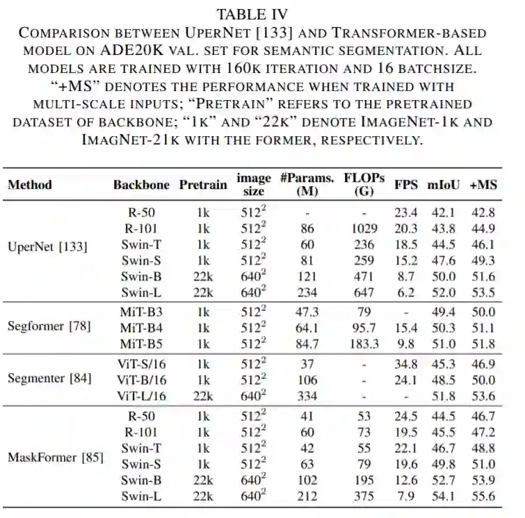 论文第 V 章主要介绍了用于分割的 Transformer。按照分割方式的不同,这些 Transformer 可以被分为两类:基于 patch 的 Transformer 和基于查询的 Transformer。后者可以进一步分解为带对象查询的 Transformer 和带掩码嵌入的 Transformer。下面这些表格展示了这些 Transformer 的性能数据。