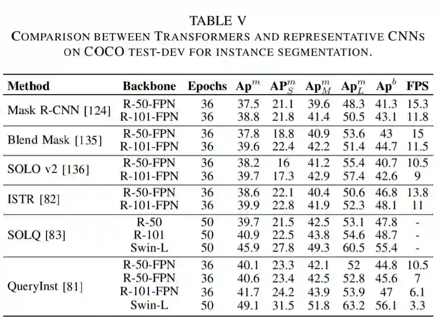 在第 IV 章中,研究者详细介绍了用于目标检测的视觉 Transformer。这些模型可以分为两类:作为颈部的 Transformer 和作为骨干的 Transformer。颈部检测器主要基于为 Transformer 结构指定的一个新表示,称为对象查询,即一组学习到的同等地聚合全局特征的参数。它们试图从加速收敛或提高性能的角度来解决最优融合范式。除了专门为检测任务设计的各种颈部外,一定比例的主干检测器也会考虑到特定的策略。最后,作者在表 II 和表 III 中比较了它们的性能,并分析了 Transformer 检测器的一些潜在改进。