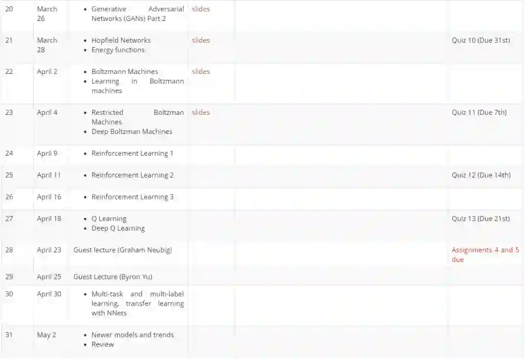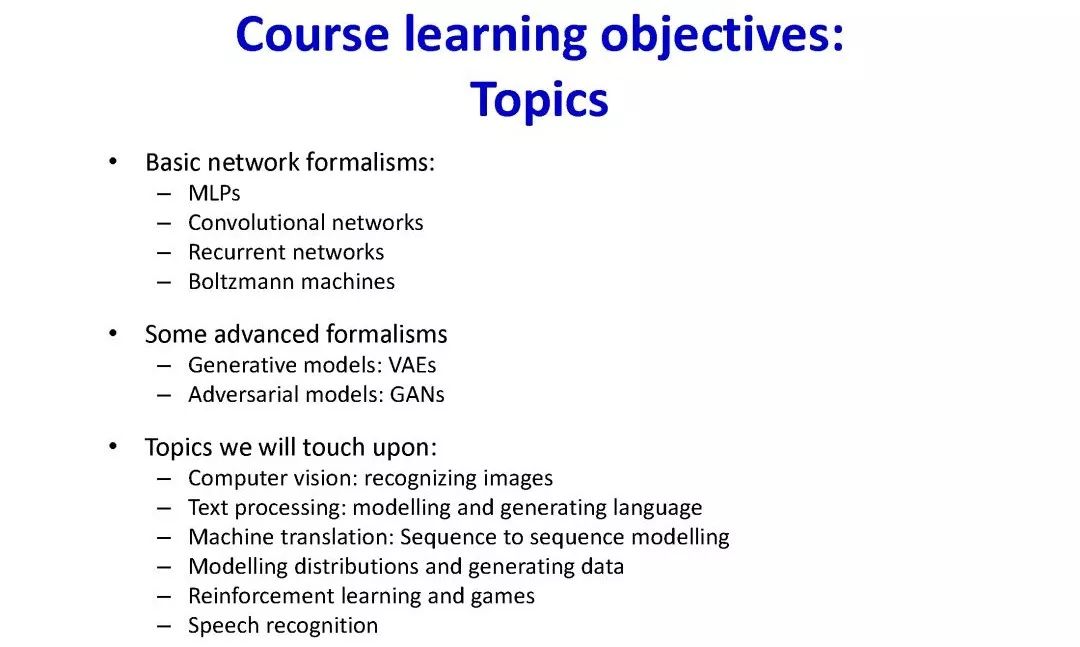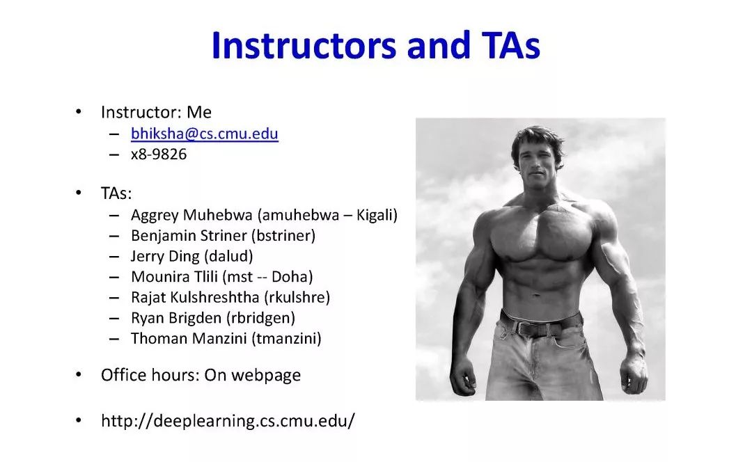 【新智元导读】卡耐基梅隆大学深度学习春季课程开课了!课程的主讲老师是卡耐基梅隆大学计算机学院的 BhikshaRaj,课程内容涵盖了深度学习的基础内容:深度学习介绍、反向传播、感知器、经验风险最小化、随机梯度下降等等,以及比较新的强化学习、对抗网络、深度 Q 学习等。在深度学习研究领域 CMU 一直走在世界前列,其课程几乎是深度学习入门首选材料,本文整理了课程的 slides 和 video,想要系统地学习并掌握深度学习的读者千万不要错过。