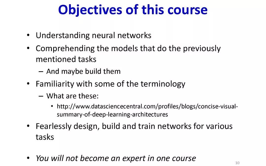 在本课程中,我们将学习深度神经网络的基础知识,以及它在各种 AI 任务中的应用。到课程结束时,学生将会对这个课题有很大的了解,并且能够将它应用到各种各样的任务。 学生还能了解当前该领域大量的文献,并通过进一步的研究扩展自己的专业知识。