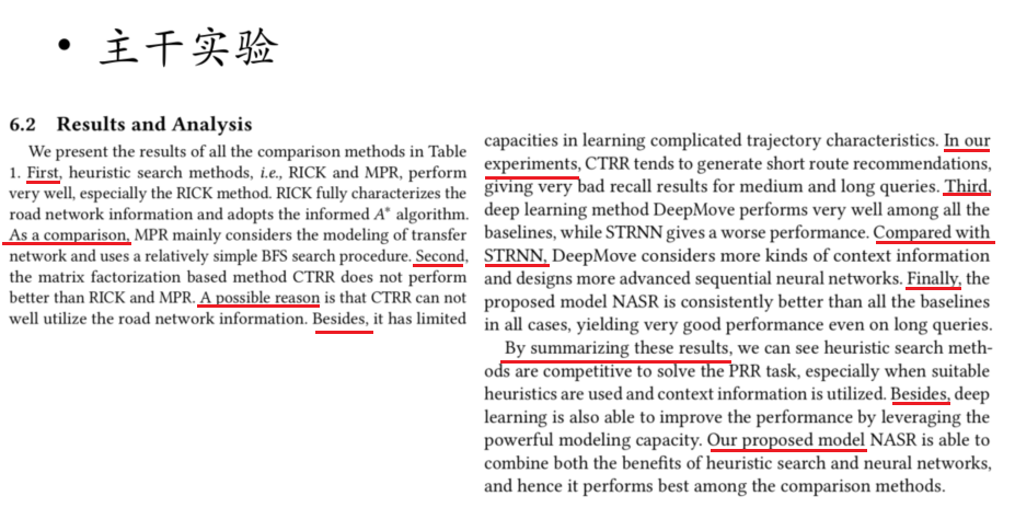 时首先自己要清楚实验目的,文章中对实验的分析是为了证明文章的贡献、发现或者结论。不要流水账一般,比如 A 比 B 好,B 比 C 好,而是要突出原因。此外若有些实验结果不如人意,也要进行分析。最后还要进行统计性检验证明提升有效。讲者举例如下,可以看到作者分析了过往方法的不足和优点,证明了自己方法的优越之处。