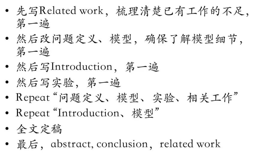 1、建议大家读论文的时候,一定先有一个大概的 topic,把论文量首先积累到 50 篇,然后开始做一个分类的操作,然后做一个重写摘要的操作,这两个事情做完以后,论文基本上确定了。不要硬写论文,一定想清楚自己的 contribution 是不是已经足够了,或者自己是不是已经做好了写论文的准备,做好文献阅读的情况下才可以写论文。