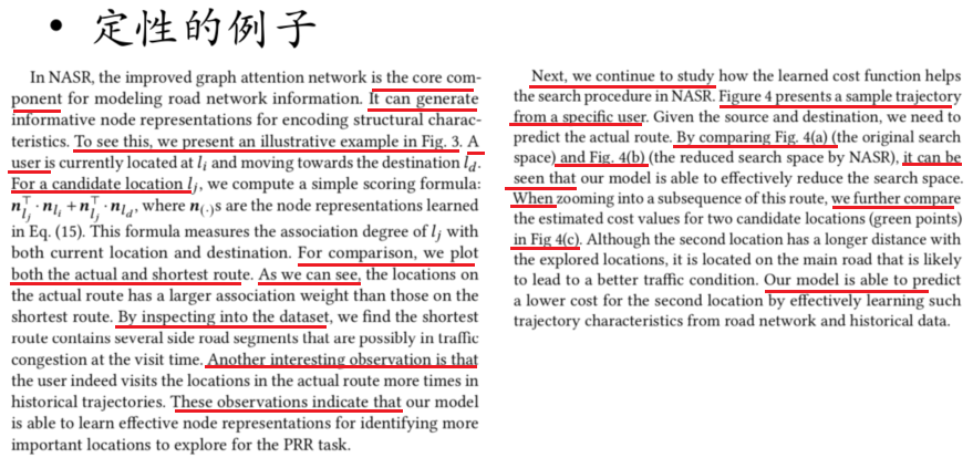 是指举例子进行实验说明。用例子来解释想法的有效性,或者解释结果显著提升是基于哪些场景,本质上是对引言中 motivation 的呼应。举例子时应该注意不要探索式的写,而要有核心驱动,也就是直截了当的去举例证明自己的 motivation。举例子的主要形式是一个图搭配一段描述。需要注意的是图的标题里要将图中的符号、颜色和整体场景设置等写清楚,而不能写在文本描述中,图本身要自洽。图画完之后要写一段对应的文本描述,首先写清楚目的,接着写清楚当前例子的整体故事,然后分解进关键部分,也就是图中哪些地方可以证明讲的故事,最后一句话进行总结。讲者举例如下,可以看到作者在图标题中将图中符号颜色等都进行了说明。