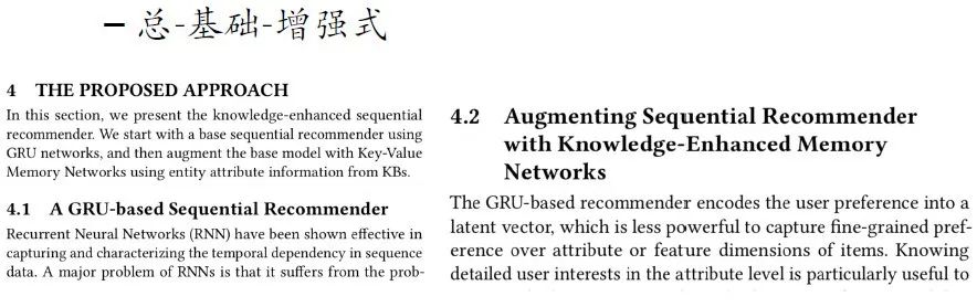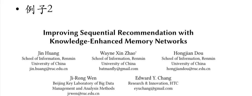 第 2 篇发表在 SIGIR 2018 上,是基于知识属性的序列推荐算法。赵鑫指出,为了帮助论文初学者们快速入门,他接下来的内容风格可能会有点像“八股文”:按照论文的撰写顺序,介绍每一个部分该怎么写,有哪些规范、技巧或教训等。