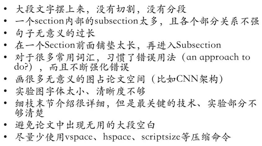 在论文写作中应该避免的问题上,除了下图列出的一些问题,还涉及到了不同 section 题目之间要有关联性和逻辑性,同时要避免无意义的长句子,对于自己文章的贡献,应该在几句话内讲明白,不要舍本逐末罗列太多创新点。此外,要注意英语词汇的正确用法,避免缩写。