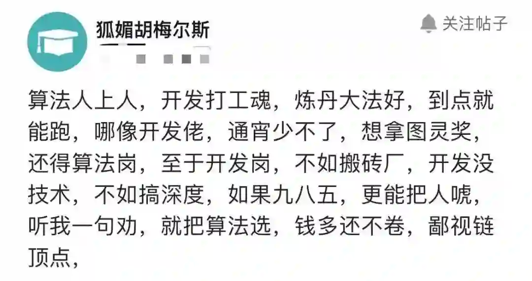 这位网友将算法和开发做了对比并写成了五言绝句,主要告诉我们相比于开发岗而言,互联网公司中的算法工程师很少需要通宵,且不需要面对无尽的需求,只需要调好自己的模型,并产生业务收益即可,这也是为什么大厂里很少能看到女生做开发,但做算法的女生相对来说却很多。