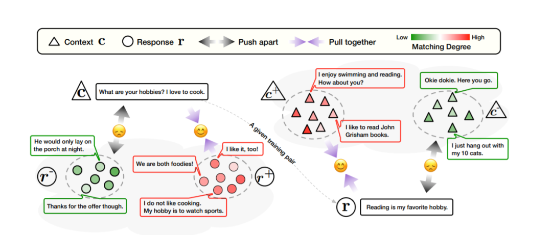 在本文中,我们将对比学习引入对话生成,其中模型明确地感知到选择好的正面和负面话语之间的差异。从对比学习的角度来看,对抗学习中的判别器将人类产生的反应视为正面话语,将合成反应视为负面话语。相反,这项工作将高度匹配的上下文响应对视为正样本,将不匹配的训练对视为负样本。特别是,我们利用预训练的基线模型作为参考。在对比学习期间,对于上下文c及其响应r,训练了目标对话模型,与参考模型相比,对正样本给出了更高的条件概率p(r | c),对负样本给出了更低的条件概率。如图1所示对于给定的训练实例,所提出的框架通过鼓励对话生成模型将匹配的样本对拉在一起并将不匹配的对在潜在空间中分开,从而明确考虑了人类对话中的多重映射关系。此外,从一对正样本和负样本中学习是非常简单的,但是,多映射关系在人与人之间的对话中占主导地位,在这种对话中,对于给定的上下文存在多个适当的响应,并且有时这种响应非常适合多个上下文,称为一对多和多对一的关系。这种复杂的多重映射关系在以前的学习框架中被忽略,这妨碍了有效的对话响应学习。如果将潜在高度匹配的对话对视为阴性样本,或者将离群值用作阳性样本,则可能会混淆模型。因此,为了考虑人类对话中的多重映射现象并纠正潜在的有问题的虚假学习样本,并提高训练的稳定性,我们通过分组对偶抽样来增强对比学习,其中对正负实例进行抽样 分别是上下文和响应。为了进一步描述组中实例之间的细微差异,我们使用匹配分数调整实例重要性,并优化加权损失。