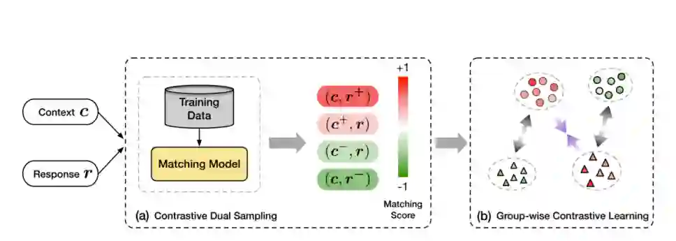 然而,在人类对话中存在多重映射关系的情况下,在对话中对正负对进行有效采样并不是那么简单,甚至存在引入错误学习样本的风险。为了处理人类对话中复杂的多重映射现象并提高训练稳定性,我们通过分组双重抽样来增强对比学习,其中分组抽样的正例和负例分别针对上下文和响应。如图2所示,对于每个训练对,它首先使用现成的会话匹配模型对一组高度匹配的示例进行采样,并对另一组与上下文和响应有关的最不匹配的话语进行采样,以建立对比示例。然后使用分组对比学习训练目标对话模型。