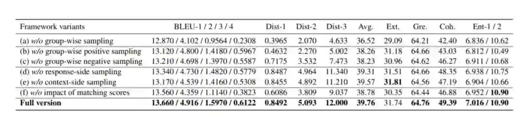 作者在三个数据集上进行了实验。PersonaChat是一种英语数据集,包含通过Amazon Mechanical Turk收集的成对说话者之间的多轮对话。Douban包含来自受欢迎的社交网络服务-中国豆瓣小组的日常对话。OpenSubtitles包含从英语电影字幕转换而来的人与人之间的对话。基线模型和消蚀实验均证明了分组式对比学习方法在对话问答生成领域的有效性。
