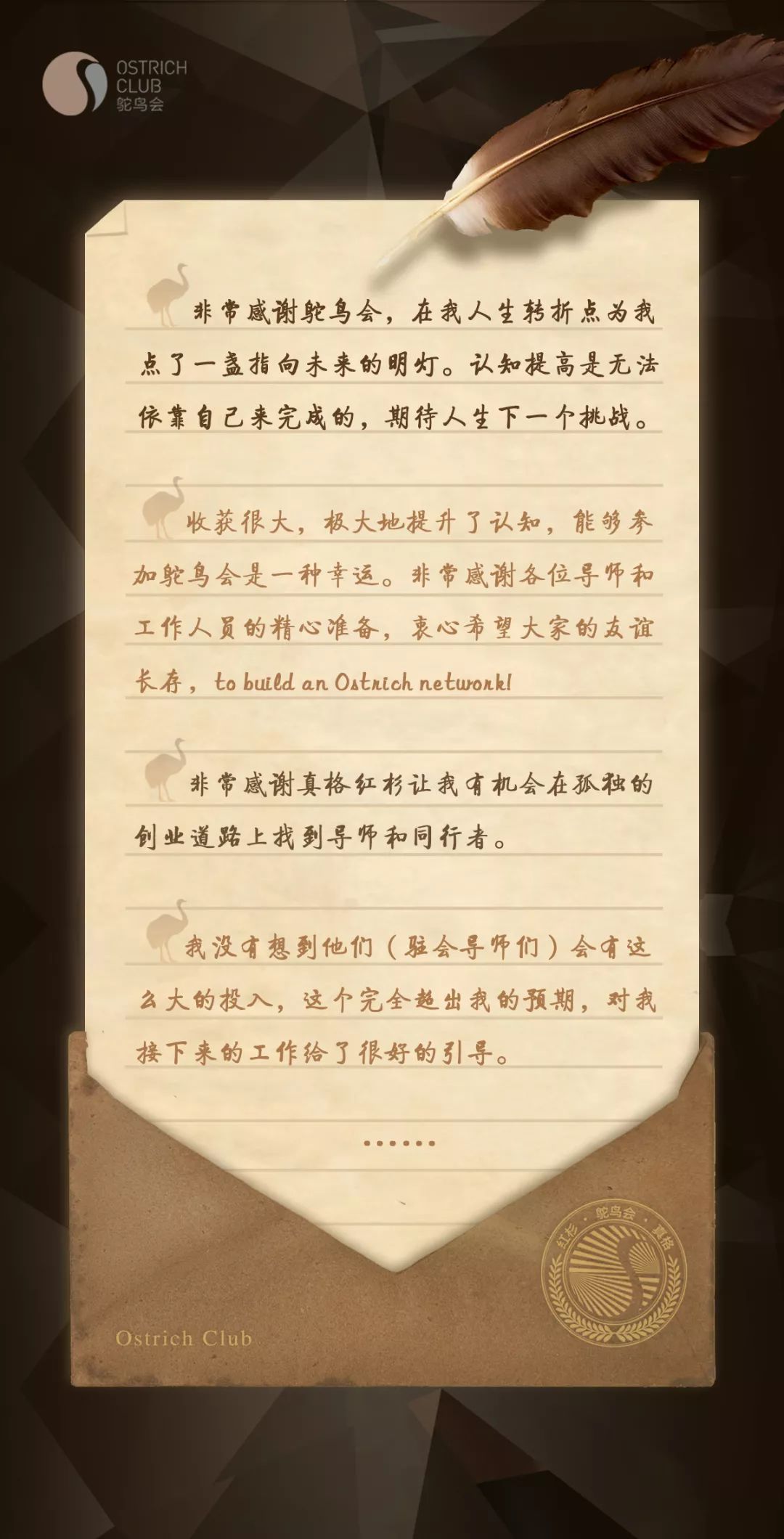 “在你的人生中如果有一刹那在鸵鸟会稍做逗留,你的未来、你的创业、你的人生将因此而大不一样。”