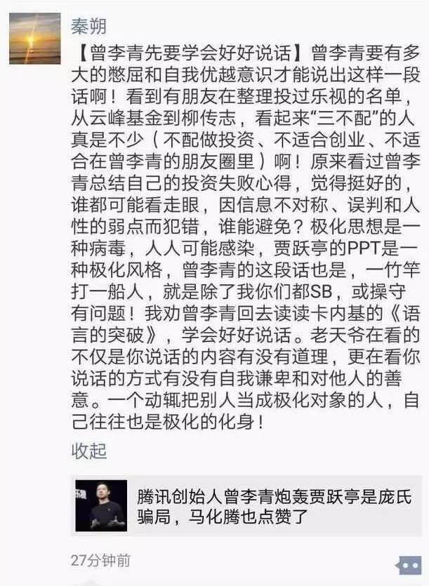 秦朔今天发了一条朋友圈,怼了曾李青。