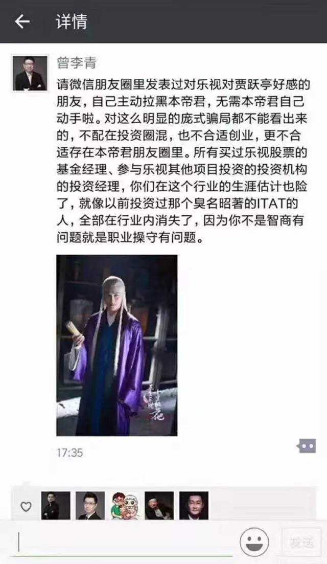 孙宏斌抬头找了半天,没看见仙踪啊。低头在手机里翻了翻,原来是腾讯的五位创始人之一曾李青,发了个帝君附体的朋友圈,说不跟这些人做朋友了。