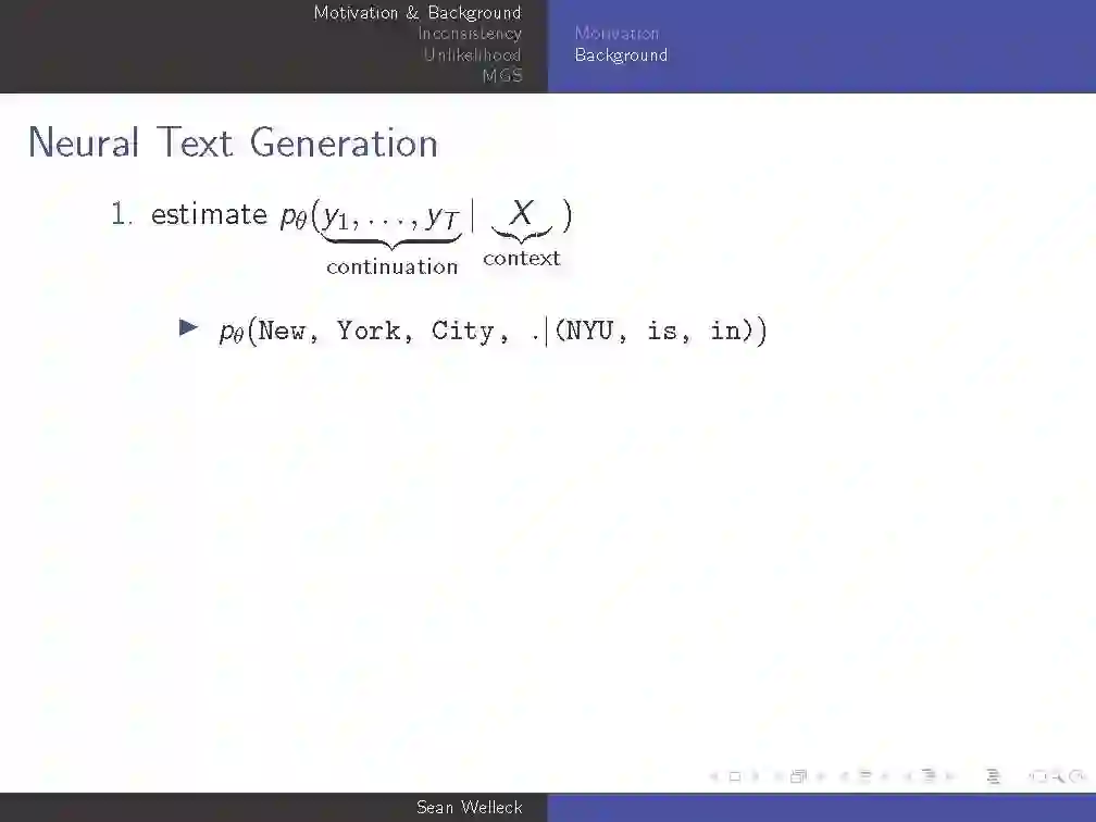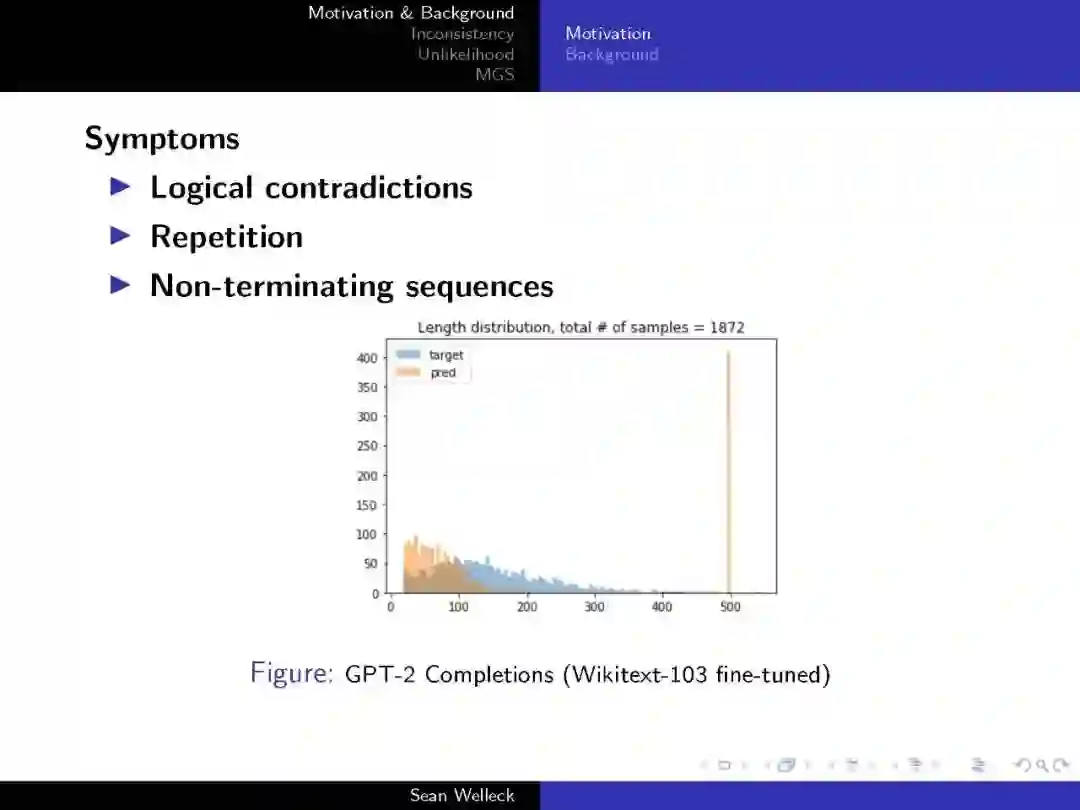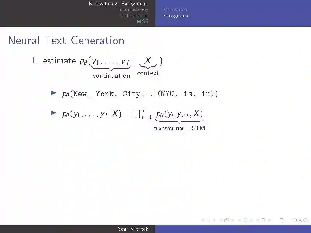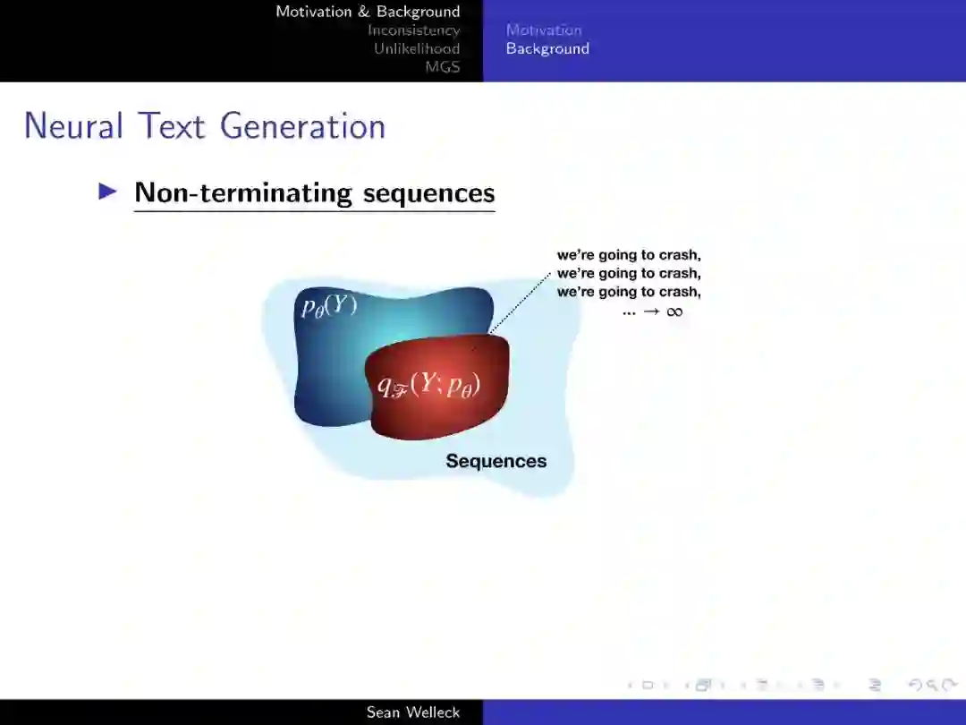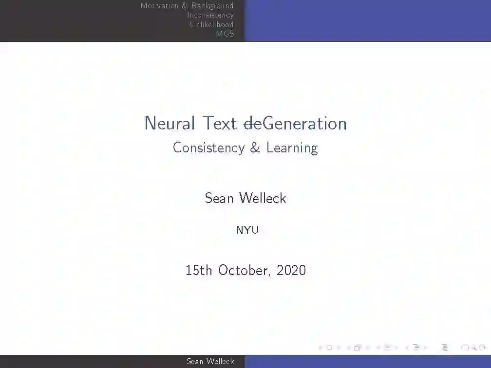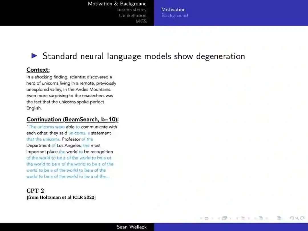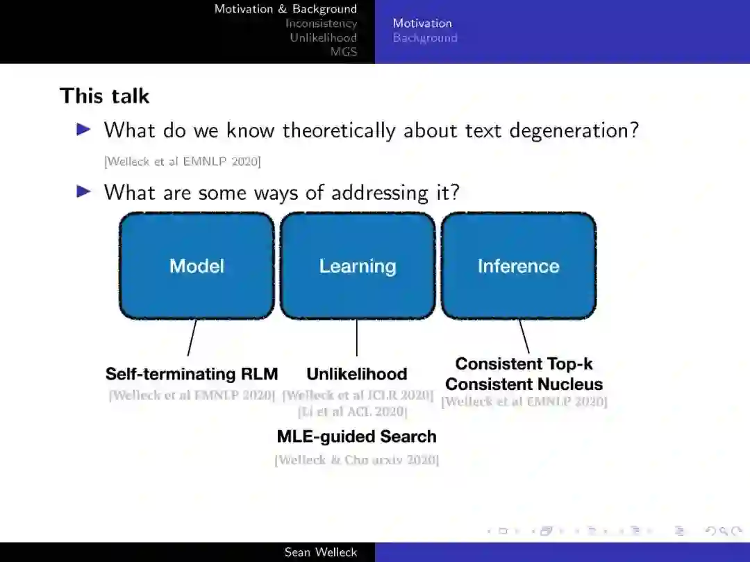 用最大似然估计训练的神经序列模型已经成为建模和生成文本的标准方法。然而,最近的研究发现了这些模型的问题。在这次谈话中,我们研究了在实践中出现的最大似然学习的退化性质,激发了新的学习方法。我们使用在生成文本中观察到的三个特性来描述简并性:非终止性、逻辑不连贯性和重复性。为了研究非终止性,我们发展了一个理论,允许我们正式证明传统的文本生成方法可以生成具有高概率的无限长序列。为了减少这三种类型的退化,我们开发了两种学习算法:非似然训练(惩罚特定任务的文本属性)和最大似然引导参数搜索(直接优化序列级损失)。