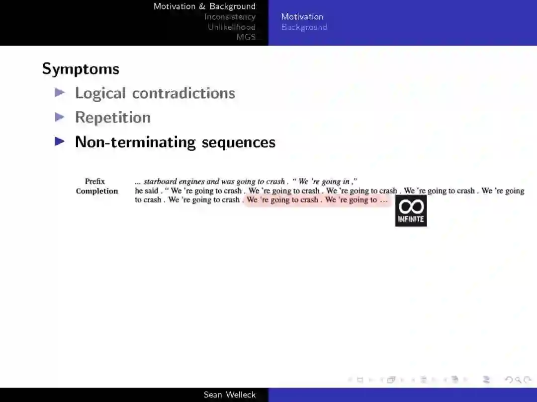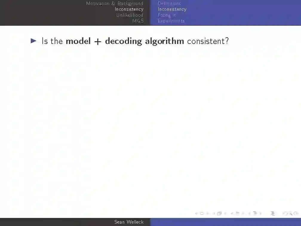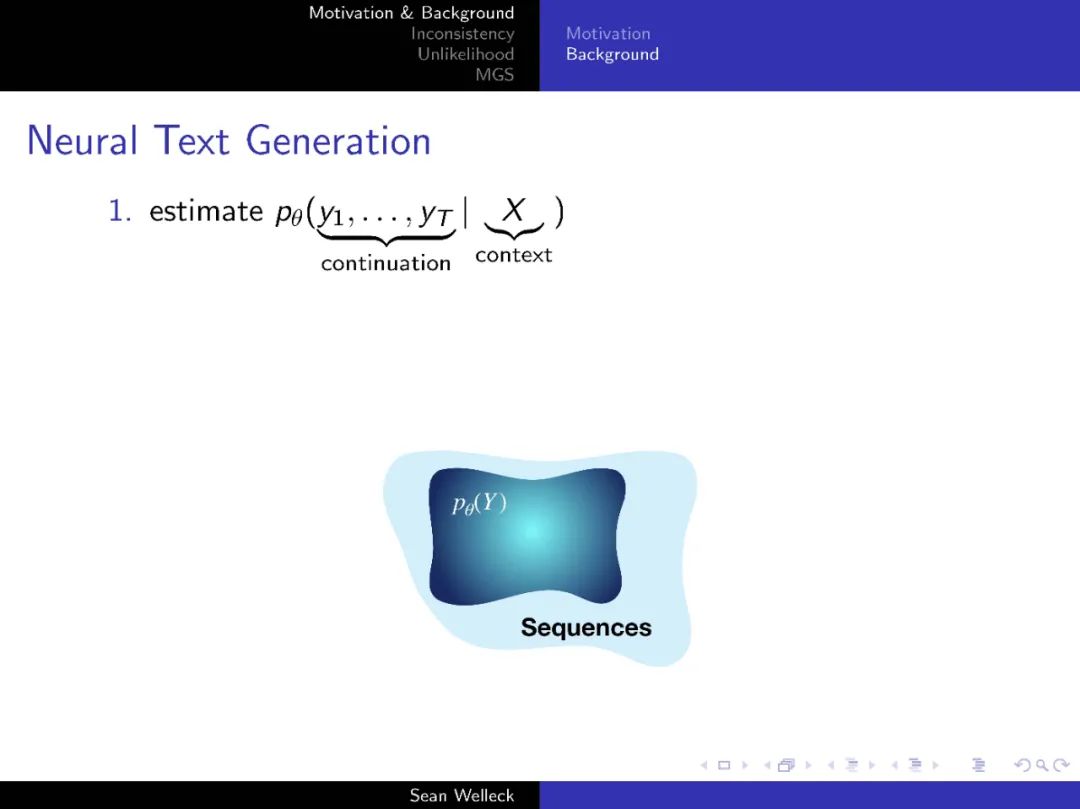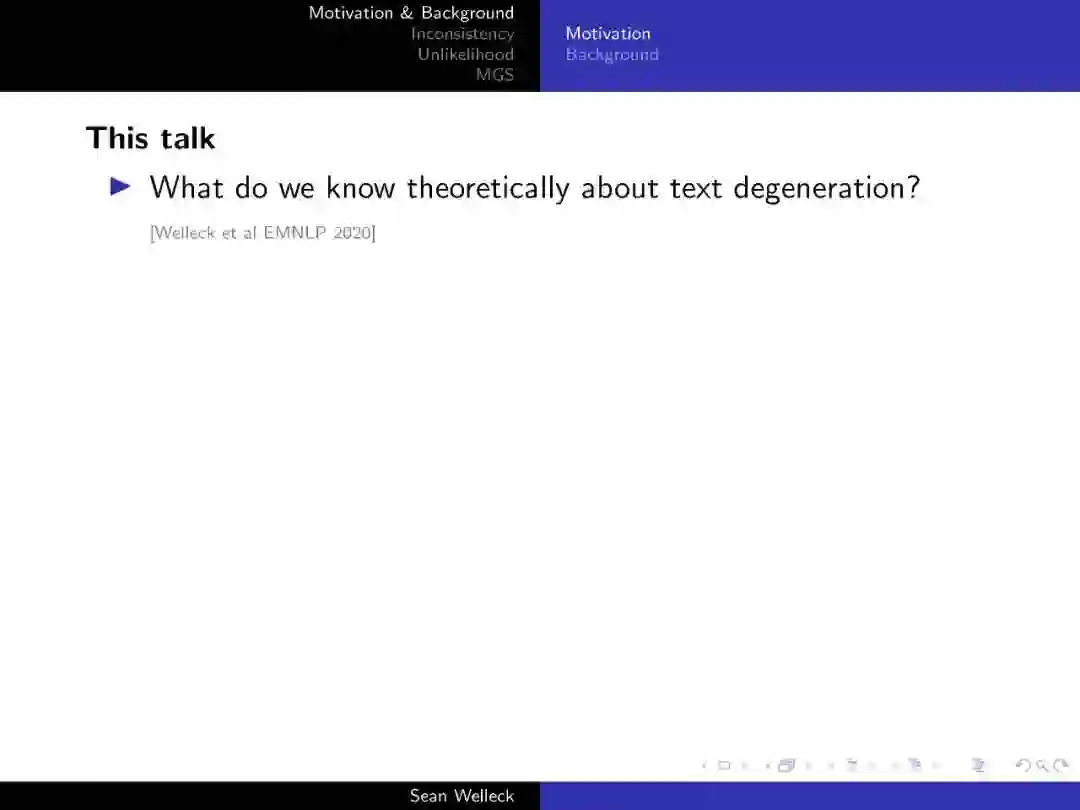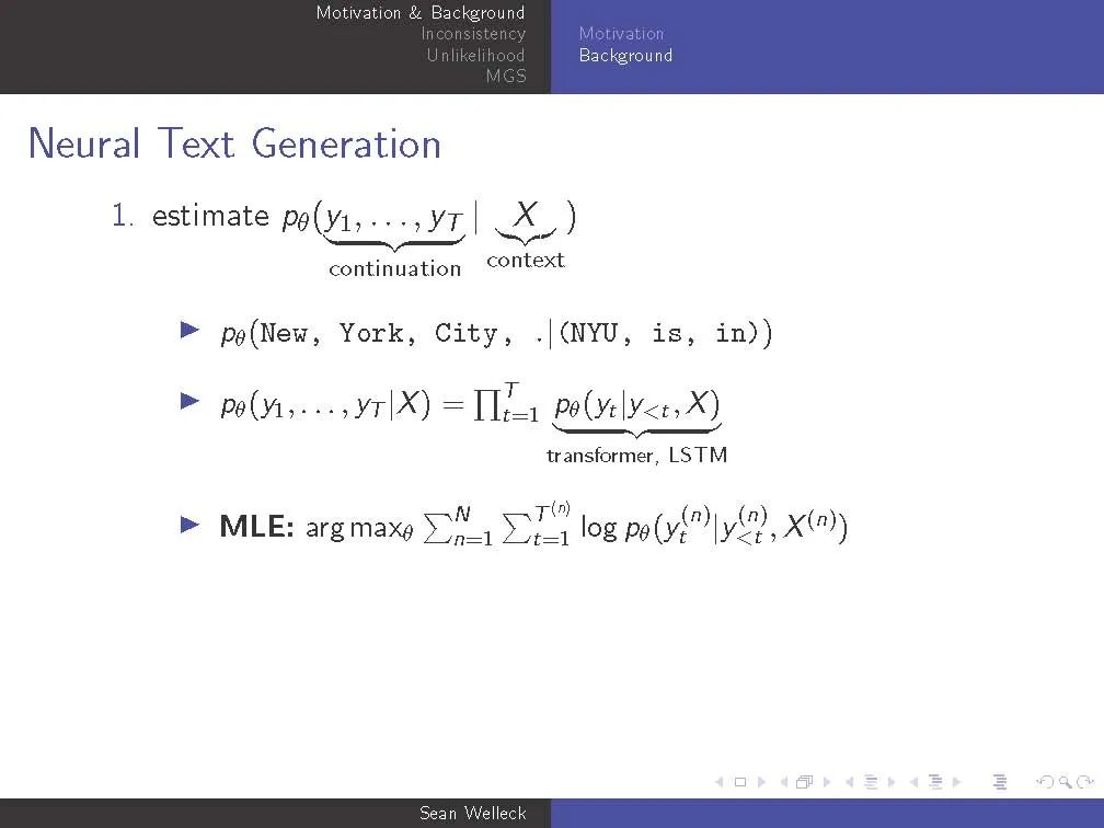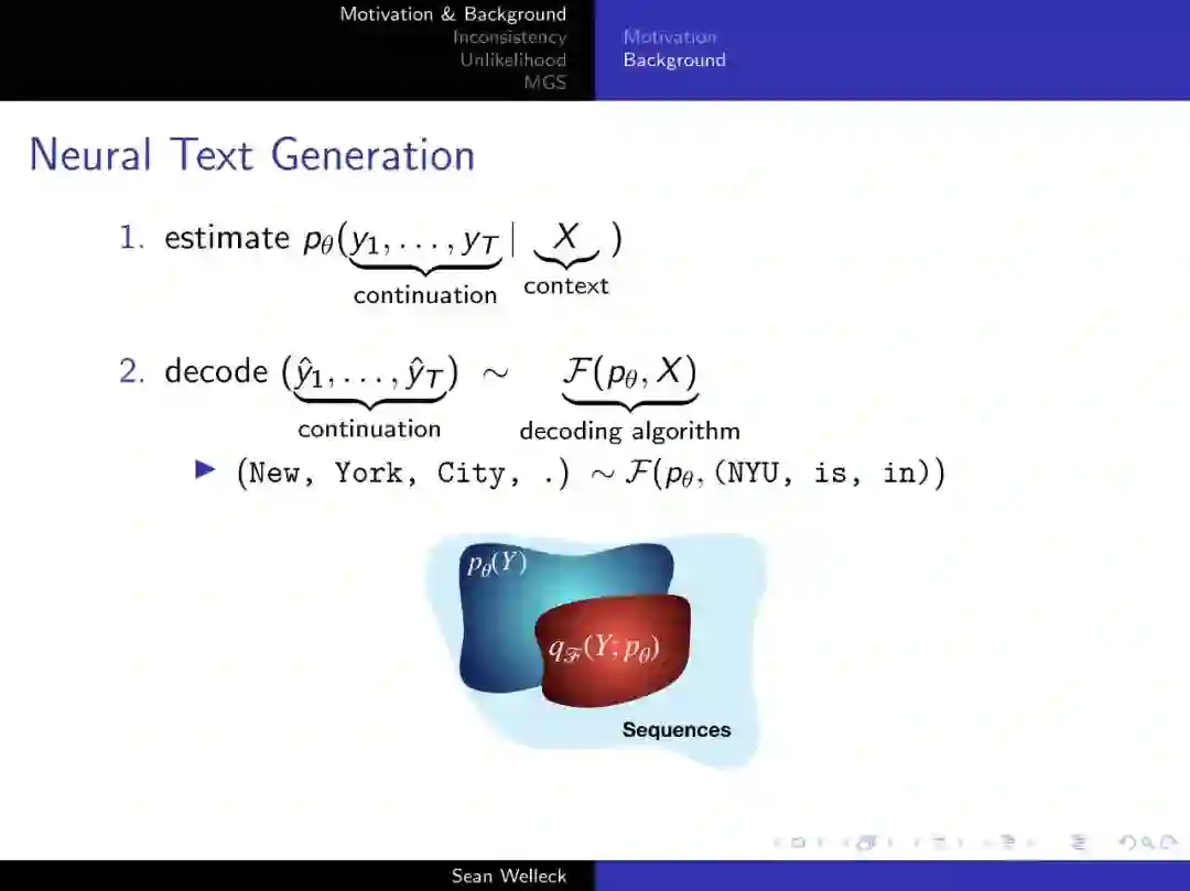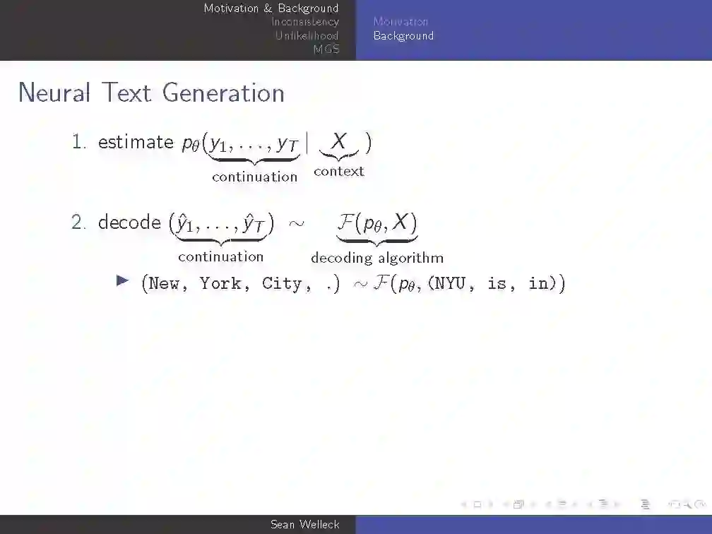 用最大似然估计训练的神经序列模型已经成为建模和生成文本的标准方法。然而,最近的研究发现了这些模型的问题。在这次谈话中,我们研究了在实践中出现的最大似然学习的退化性质,激发了新的学习方法。我们使用在生成文本中观察到的三个特性来描述简并性:非终止性、逻辑不连贯性和重复性。为了研究非终止性,我们发展了一个理论,允许我们正式证明传统的文本生成方法可以生成具有高概率的无限长序列。为了减少这三种类型的退化,我们开发了两种学习算法:非似然训练(惩罚特定任务的文本属性)和最大似然引导参数搜索(直接优化序列级损失)。