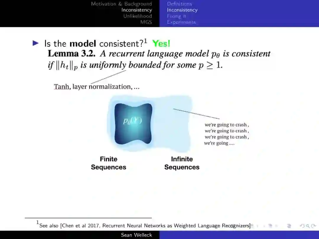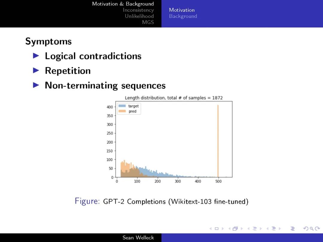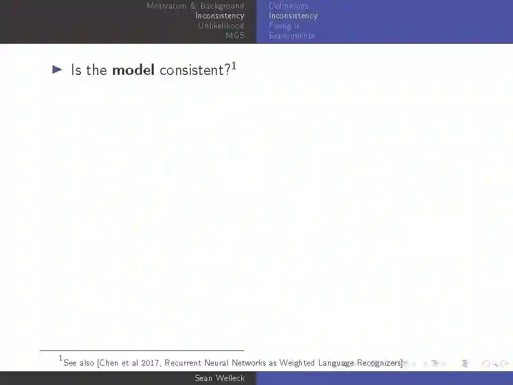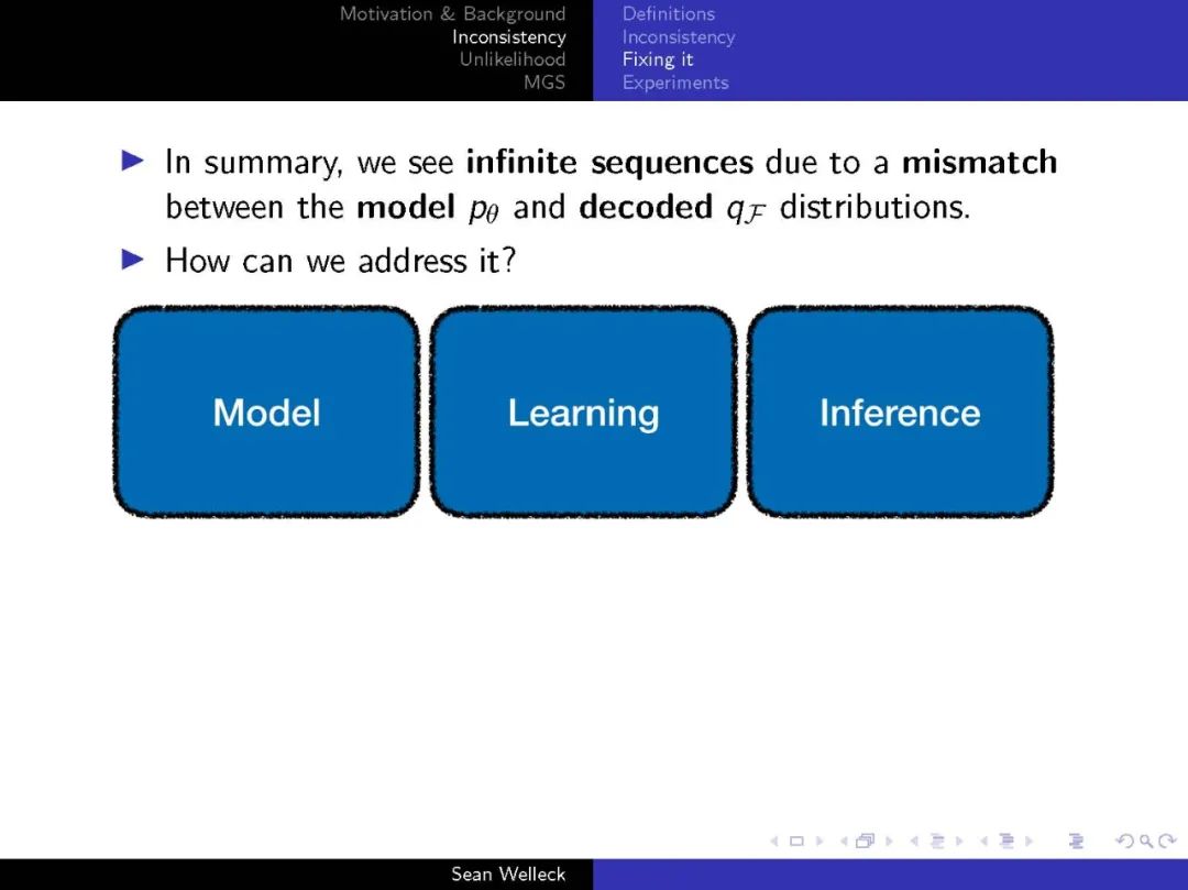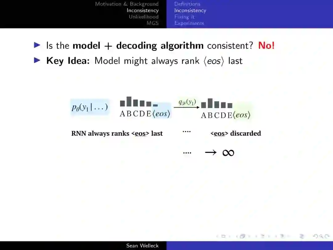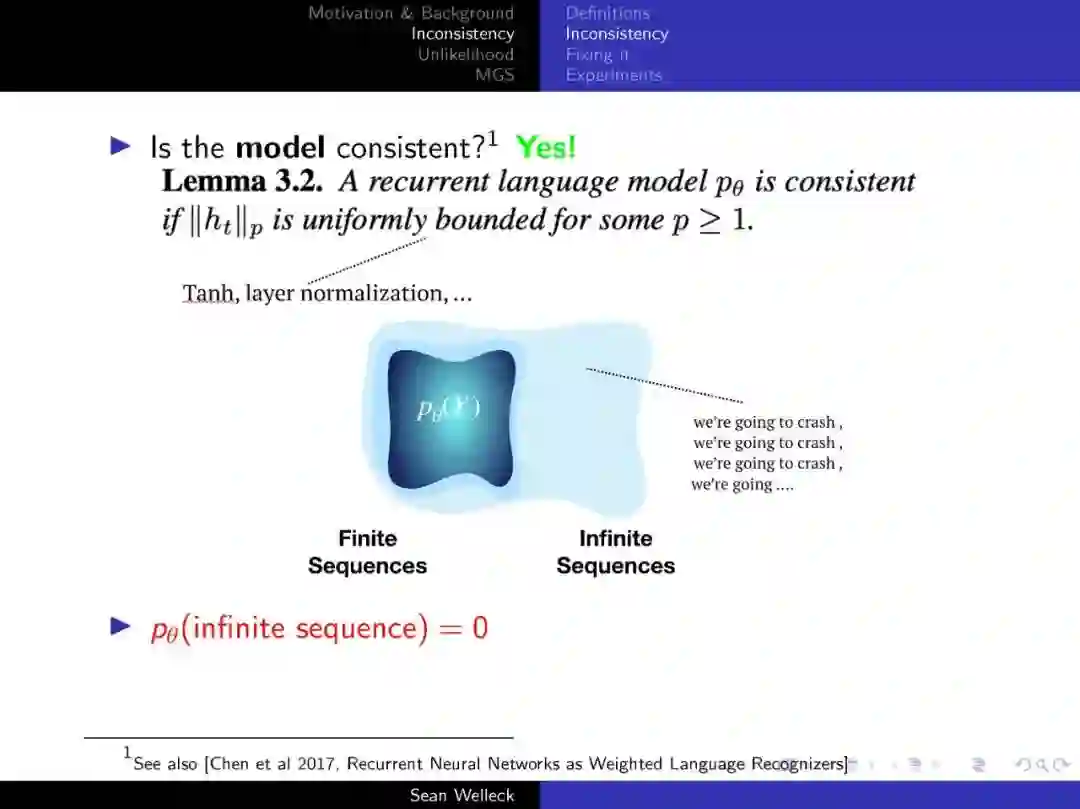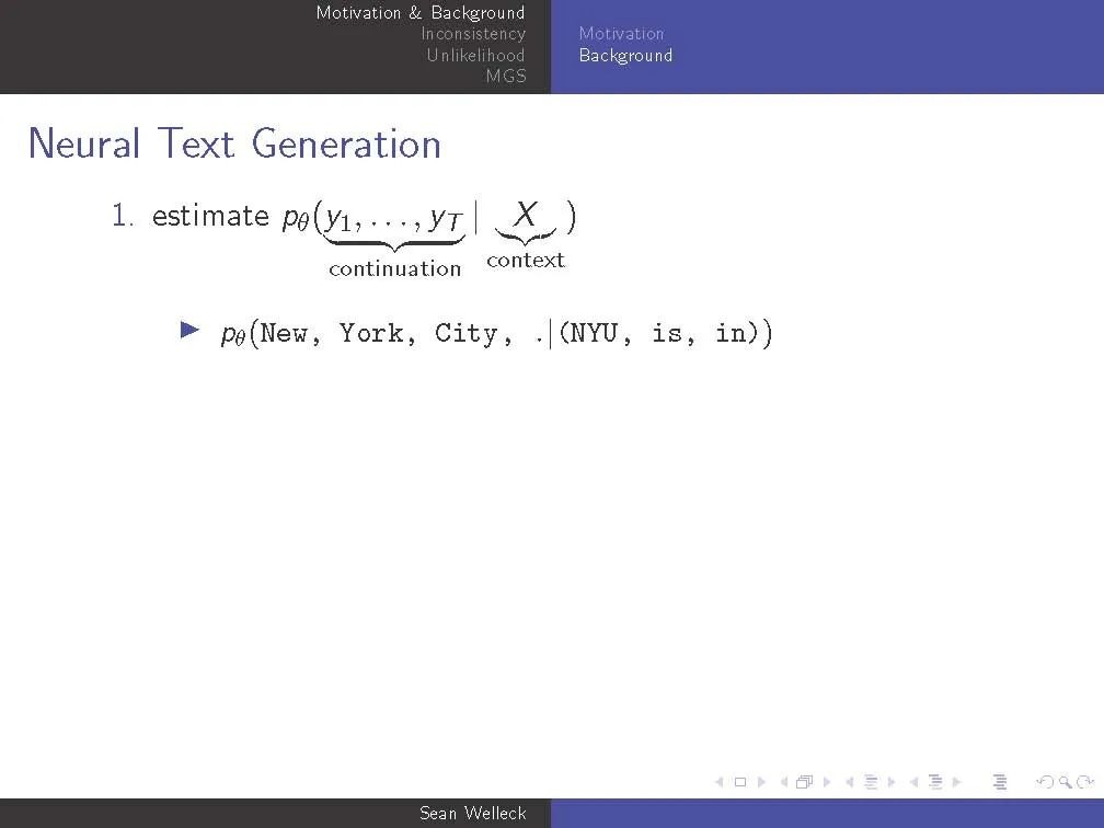 用最大似然估计训练的神经序列模型已经成为建模和生成文本的标准方法。然而,最近的研究发现了这些模型的问题。在这次谈话中,我们研究了在实践中出现的最大似然学习的退化性质,激发了新的学习方法。我们使用在生成文本中观察到的三个特性来描述简并性:非终止性、逻辑不连贯性和重复性。为了研究非终止性,我们发展了一个理论,允许我们正式证明传统的文本生成方法可以生成具有高概率的无限长序列。为了减少这三种类型的退化,我们开发了两种学习算法:非似然训练(惩罚特定任务的文本属性)和最大似然引导参数搜索(直接优化序列级损失)。