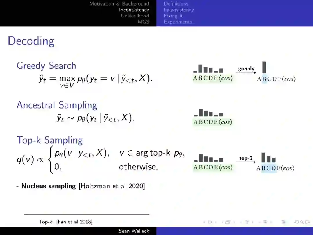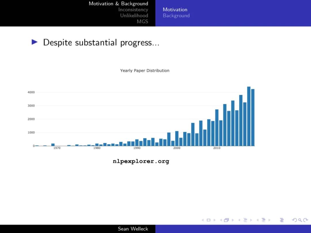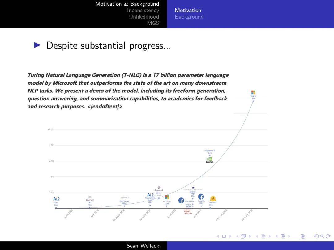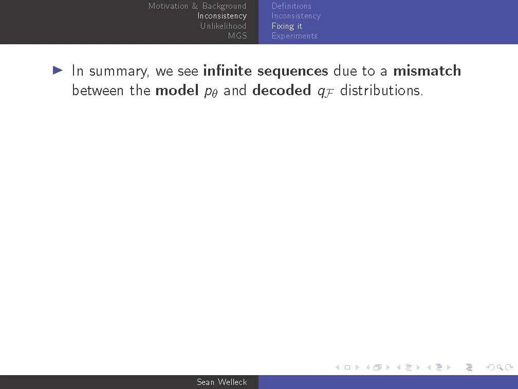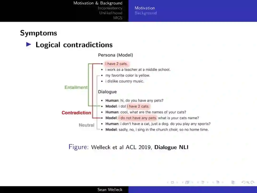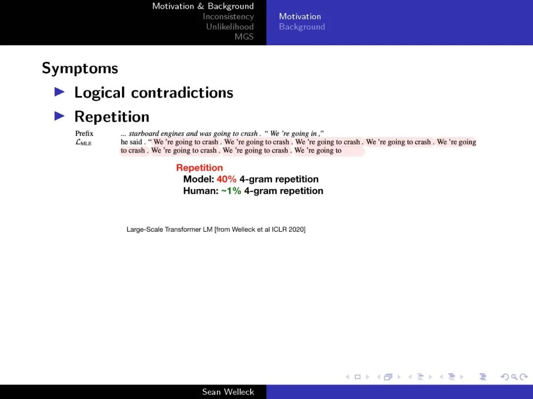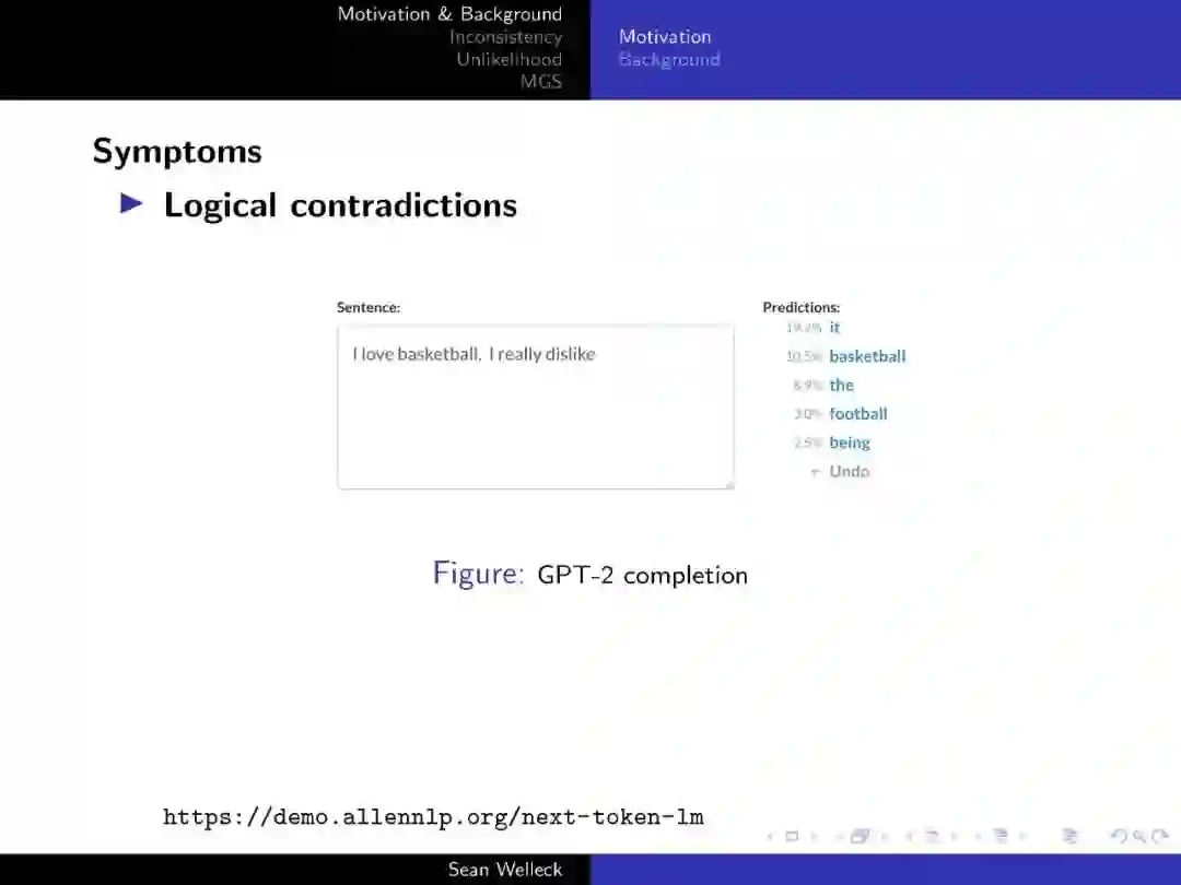 用最大似然估计训练的神经序列模型已经成为建模和生成文本的标准方法。然而,最近的研究发现了这些模型的问题。在这次谈话中,我们研究了在实践中出现的最大似然学习的退化性质,激发了新的学习方法。我们使用在生成文本中观察到的三个特性来描述简并性:非终止性、逻辑不连贯性和重复性。为了研究非终止性,我们发展了一个理论,允许我们正式证明传统的文本生成方法可以生成具有高概率的无限长序列。为了减少这三种类型的退化,我们开发了两种学习算法:非似然训练(惩罚特定任务的文本属性)和最大似然引导参数搜索(直接优化序列级损失)。