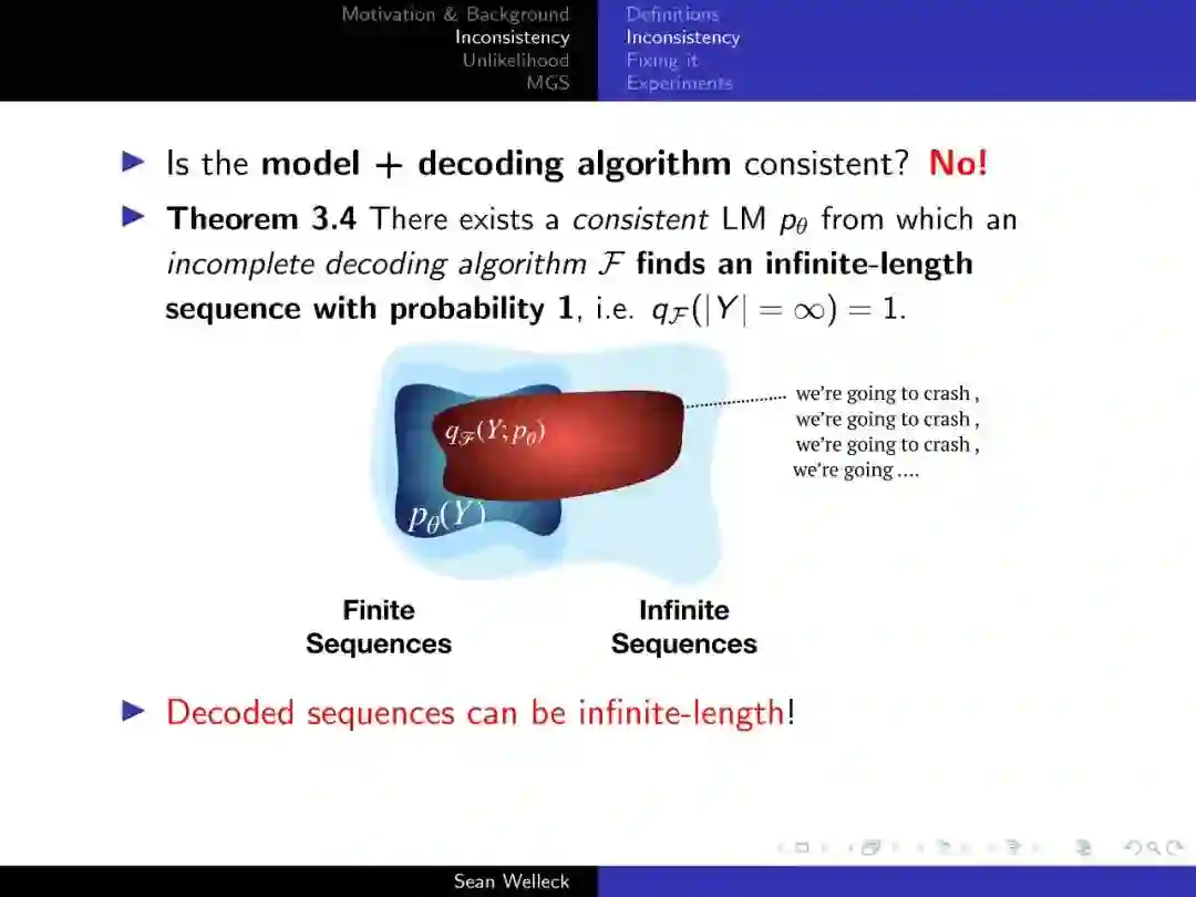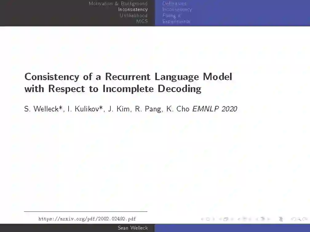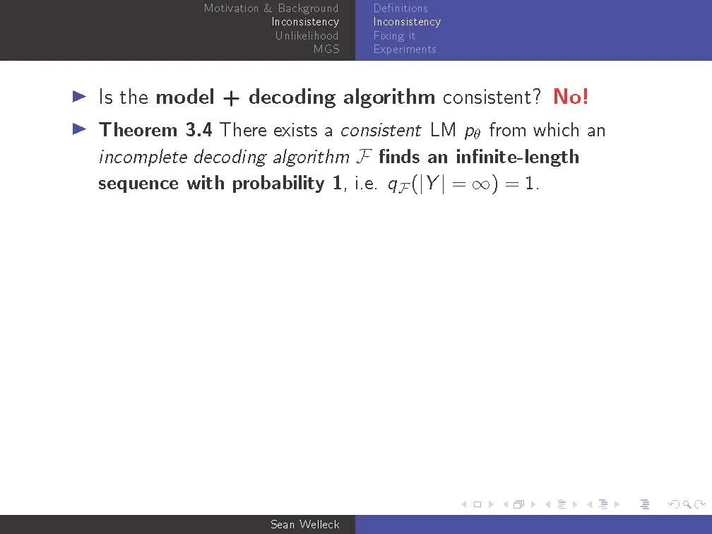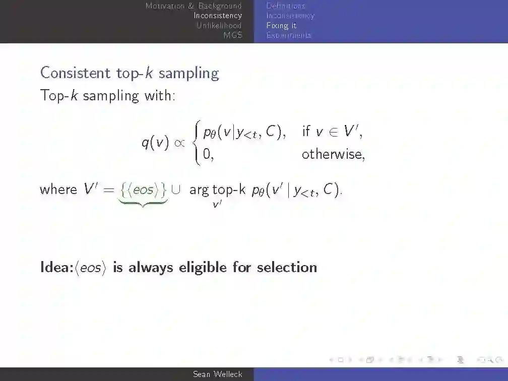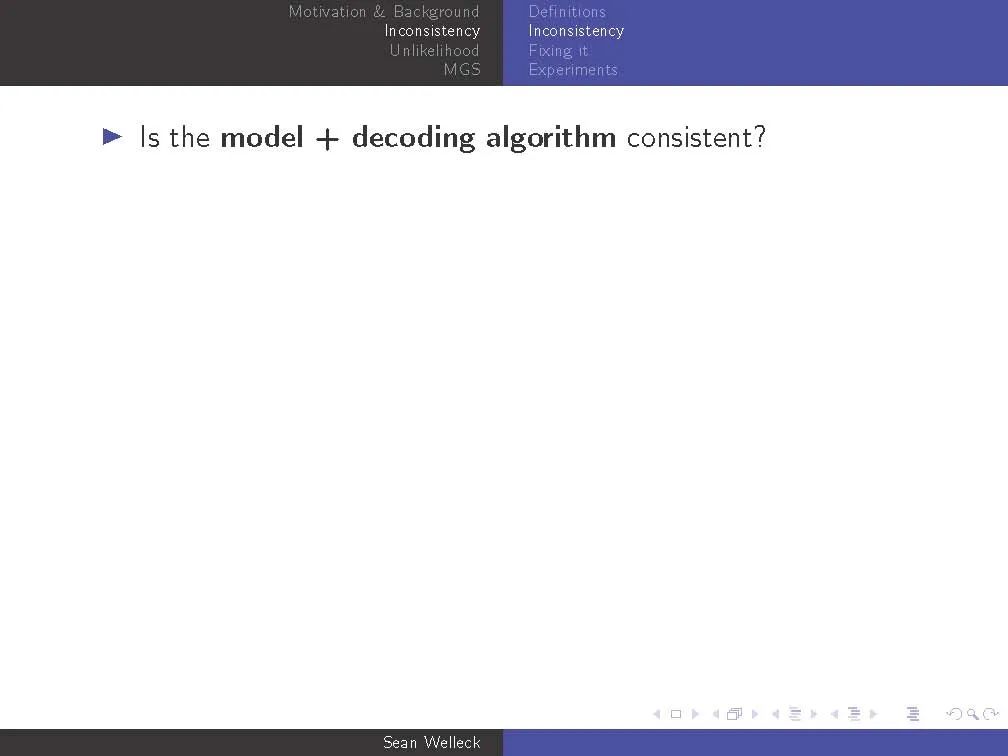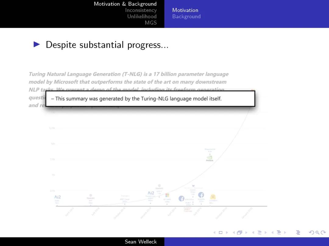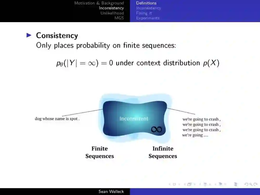 用最大似然估计训练的神经序列模型已经成为建模和生成文本的标准方法。然而,最近的研究发现了这些模型的问题。在这次谈话中,我们研究了在实践中出现的最大似然学习的退化性质,激发了新的学习方法。我们使用在生成文本中观察到的三个特性来描述简并性:非终止性、逻辑不连贯性和重复性。为了研究非终止性,我们发展了一个理论,允许我们正式证明传统的文本生成方法可以生成具有高概率的无限长序列。为了减少这三种类型的退化,我们开发了两种学习算法:非似然训练(惩罚特定任务的文本属性)和最大似然引导参数搜索(直接优化序列级损失)。