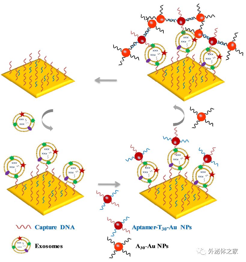 首先,用捕获DNA功能化Au膜,并通过直接测量检测靶外泌体。然后加入适体/ T30连接的AuNP,并通过单个AuNP扩增的SPR适体传感器检测靶外泌体。最后,通过两个互补序列(T30和A30)的杂交,可以在适体/ T30连接的AuNP上捕获A30包被的AuNP,并且通过双AuNP扩增的SPR适体传感器检测靶外泌体。进行AuNP辅助的信号放大,检测低浓度的外泌体。该方法为灵敏外泌体检测提供了有效途径,是生物学和临床研究中应用的有前途的技术。