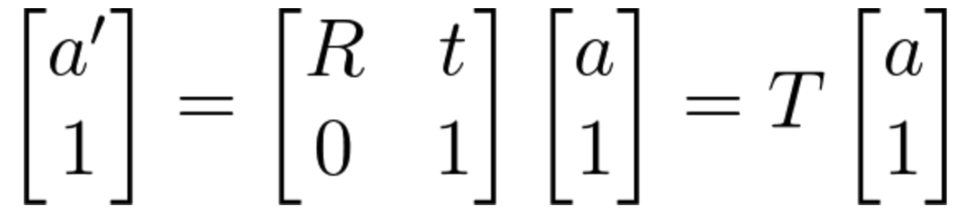 此时,齐次坐标就显示出它的魅力了,如果使用齐次坐标来表达 a' = R*a + t 的话可以写为: