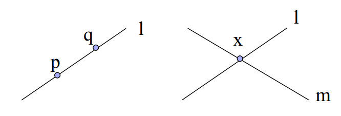 也可以使用两条直线 l, m 的叉乘表示他们的交点 x