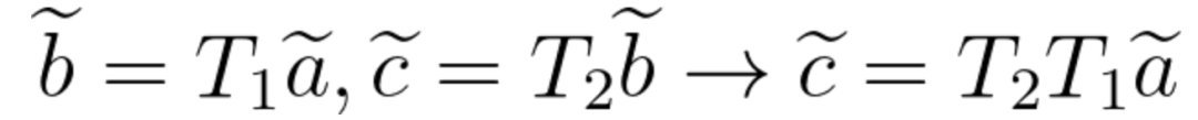 但是,我们知道SLAM中一般都是连续的欧氏变换,所以会有多次连续的旋转和平移,假设我们将向量a进行了两次欧氏变换,分别为R1, t1 和 R2,t2,分别得到: