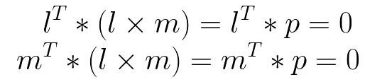 原因如下:首先,根据前面叉乘的定义,l x m 的结果向量(记为 p = l x m) 与 l 和 m都垂直,根据点乘的定义,垂直的向量之间的点积为0,因此可以得到: