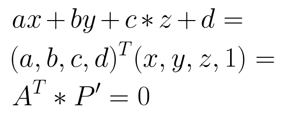 同理,我们知道 三维空间的一个平面A可以用方程 ax + by + cz + d = 0 来表示,三维空间的一个点P=(x, y, z) 的齐次坐标 P'=(x, y, z, 1),类似的,点P在空间平面A上可以用两个向量的内积来表示,如下: