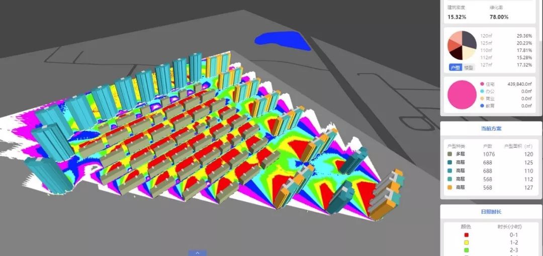 输入容积率、日照时间、绿化覆盖率等基本限定条件,系统能够智能审图,实时生成三维建模,极速完成每个指标的审核;设计师还可将区域进行不同功能划分,实时反馈楼栋数量,快速判断不同产品在基地上的楼栋数,以及与目标容积率的关系。