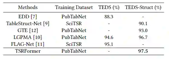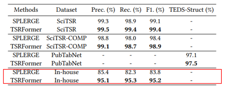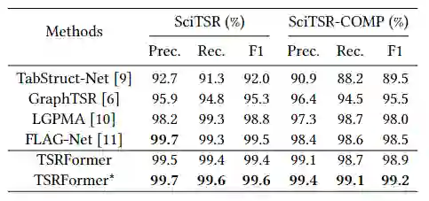 表1:TSRFormer 与现有方法在 SciTSR 上的性能对比