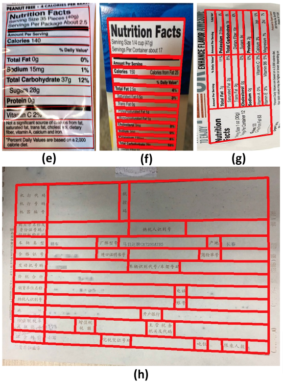 表格抽取技术解决的主要问题是如何自动地将图像中的表格数字化,其包含两个子任务:表格检测和表格结构识别。其中,表格结构识别旨在从表格的图像中还原表格的结构信息,包括每个单元格的坐标位置以及每个单元格所属的行列信息。如图2所示,在实际场景中,表格结构识别是一个极具挑战性的问题。其挑战的难度主要在于表格的结构与内容的复杂多样性,例如存在完全无边界和实线的表格、包含许多空白单元格或者跨行跨列单元格的表格、行列之间存在大片空白区域的表格、嵌套的表格、密集的大表格、单元格包含多行文字内容的表格等等。不仅如此,在相机拍摄的场景中,有些表格的边框可能因拍摄角度而倾斜或弯曲,这都大大增加了表格结构识别的难度。