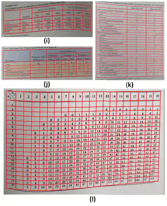 图7:TSRFormer 在各个数据集上的可视化结果(左右滑动查看更多)。(a-b)来自 SciTSR,(c-d)来自 PubTabNet,(e-h)来自 WTW,以及(i-l)来自内部数据集