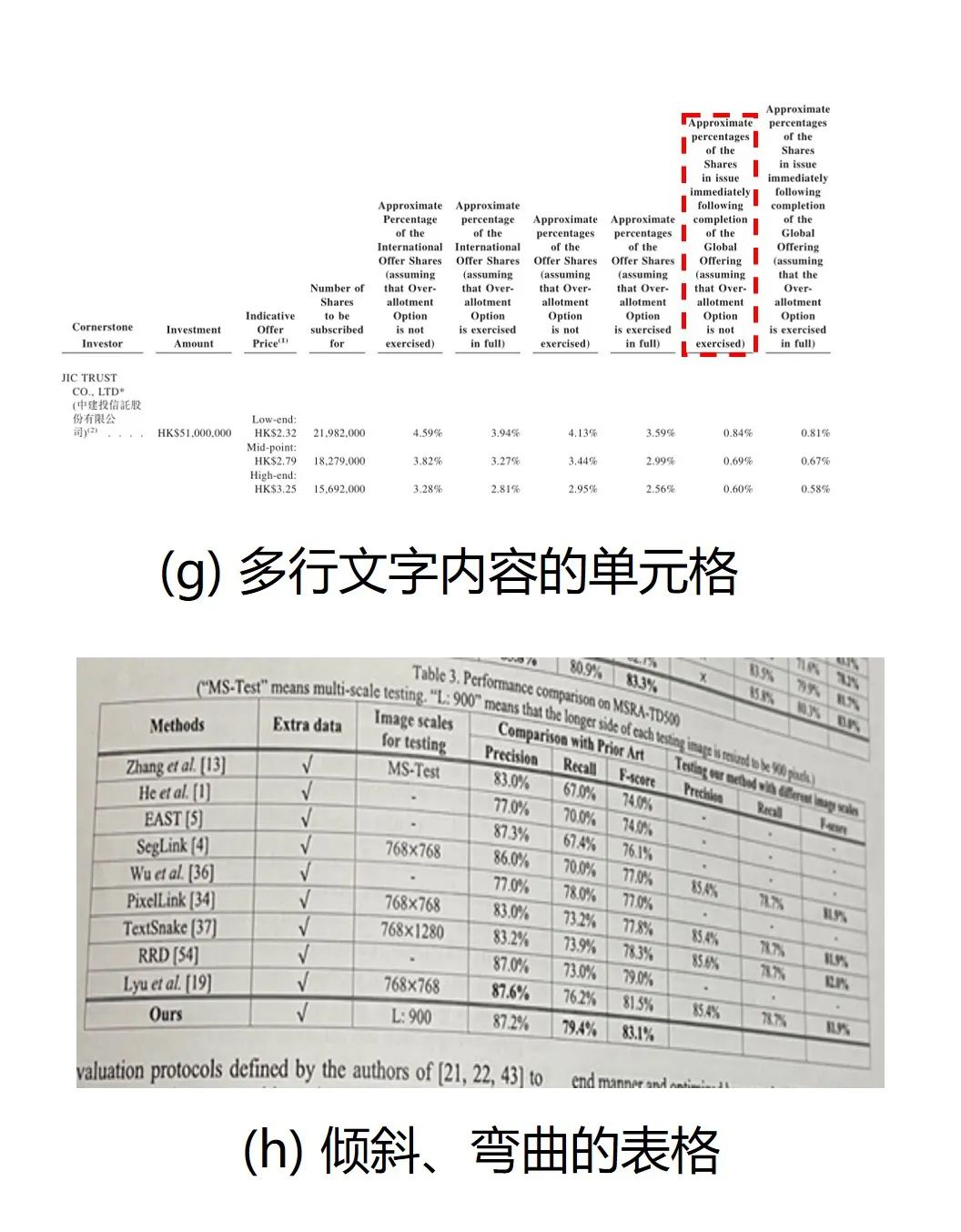 目前,学术界的绝大部分公开数据集都只包含 PDF 或者扫描文档图像中完全横平竖直的表格(如 SciTSR[6]、PubTabNet[7] 等)。与实际应用场景相比,这类数据集较为简单,不能涵盖日常生活中的所有表格类型。近一年,复杂场景中的表格结构识别问题逐渐受到关注,例如去年新发布的 WTW 数据集[8]就开始考虑实际自然场景中的表格。在该数据集中,由于相机拍摄引起的干扰,一些表格会出现倾斜或弯曲,这大大增加了表格结构识别问题的难度。但 WTW 数据集只考虑了分割线均为实线的表格,而没有包含无实线的表格。为了能够更全面地测试模型在各类场景下的性能,研究员们收集了一个更加复杂的数据集,该数据集包含了各式各样复杂场景的样本,例如结构复杂、包含大量空单元格或长跨行跨列单元格的无实线表格,以及倾斜甚至弯曲的表格等等。