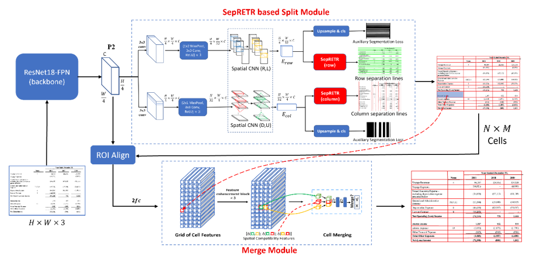 不同于以上两种范式,微软亚洲研究院的研究员们发现基于拆分-合并范式的方法具有更强的可扩展性,在复杂场景中只需要较少的训练数据就能达到很高的精度,而且可以鲁棒地处理包含空白单元格以及空行空列的表格。因此,基于该范式研究员们提出了 TSRFormer。如图3所示,对于输入的表格图像,TSRFormer 先由拆分模块预测出所有行、列的表格分割线,求交点后,生成 N x M 个单元格,再由合并模块预测相邻单元格是否需要合并从而恢复出跨多行、多列的单元格。