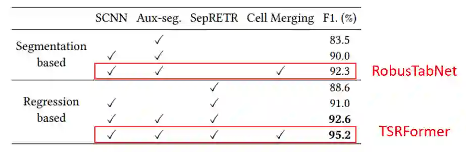 在表5的消融实验中,研究员们将基于直接回归的 TSRFormer 与目前基于图像分割的最优方案 RobusTabNet 进行了对比。TSRFormer 与 RobusTabNet 均能处理倾斜或弯曲的表格。根据表5的实验结果,在更具挑战性的内部数据集中,相比 RobusTabNet,TSRFormer 的 F1-score 高出2.9%。关于消融实验的其他细节,可见论文[1]。