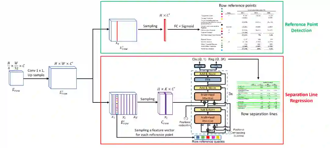 为了让 TSRFormer 能够精确且高效地预测表格分割线,研究员们还提出了一套新的基于两阶段 DETR[4] 的分割线回归算法:SepRETR。如图4所示,在第一阶段中,SepRETR 先用参考点预测模块,为每一条表格分割线预测出一个参考点(reference point);在第二阶段,由这些参考点的视觉以及空间信息组成的特征向量集合作为查询特征(query)输入进一个解码器(Transformer decoder)来回归对应的完整分割线。