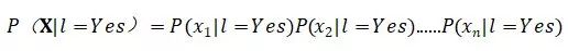 我们注意到X是个向量,它包含了每个特征的取值,于是我们可以将P(X|l=Yes)视为各个特征取值的条件概率下的联合概率,如果我们继续假设特征之间互相独立,那么联合概率就变得非常容易计算: