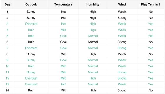 假如我们面临的问题是,根据天气、温度、湿度和风力4个特征来预测要不要去打网球,我们训练样本如下图所示: